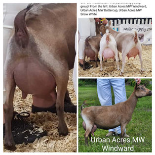 Skylar's dam won Grand champion and best udder at the Hell's Canyon show in 2020. She also won Reserve Champion with best udder in ring 1 at the Rogue Valley Show 2020. In 2017, she was 10th place 2 year old and member of 5th place Senior Get of Sire at ADGA Nationals. Skylar's full sister, Urban Acres MW Windward 01-02 VVVV86, was 9th place yearling at 2021 Nationals. Windy milked over 1000 pounds in her 3rd lactation. Sire's dam, GCH Urban Acres ASD Fairey won 1st place 7 year old.
